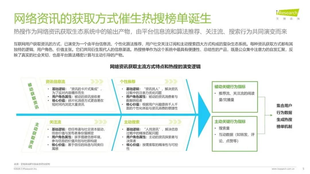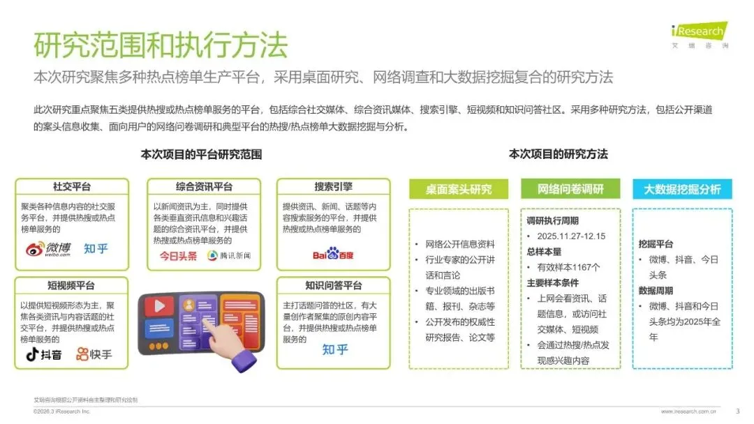 此次研究重点聚焦五类提供热搜或热点榜单服务的平台,包括综合社交媒体、综合资讯媒体、搜索引擎、短视频和知识问答社区。采用多种研究方法,包括公开渠道的案头信息收集、面向用户的网络问卷调研和典型平台的热搜/热点榜单大数据挖掘与分析。
