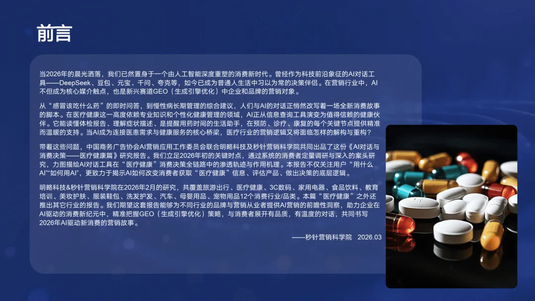 这份由中国商务广告协会 AI 营销应用工作委员会、明略科技与秒针营销科学院联合发布的 2026 年 3 月报告,基于全国 1000 名 AI 对话工具用户的调研,全面呈现 AI 在医疗健康消费决策中的渗透现状、影响机制与用户态度,为品牌 GEO 策略提供数据支撑。————
