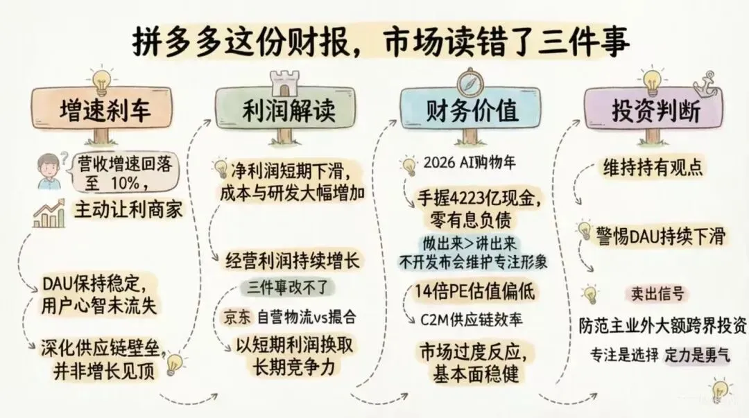 三件事加在一起看:增速放缓是主动让利换来的供应链深度,利润下滑是投资账单不是溃败账单,4200亿现金叠加14倍PE是市场定价了一个它没有的悲观故事。