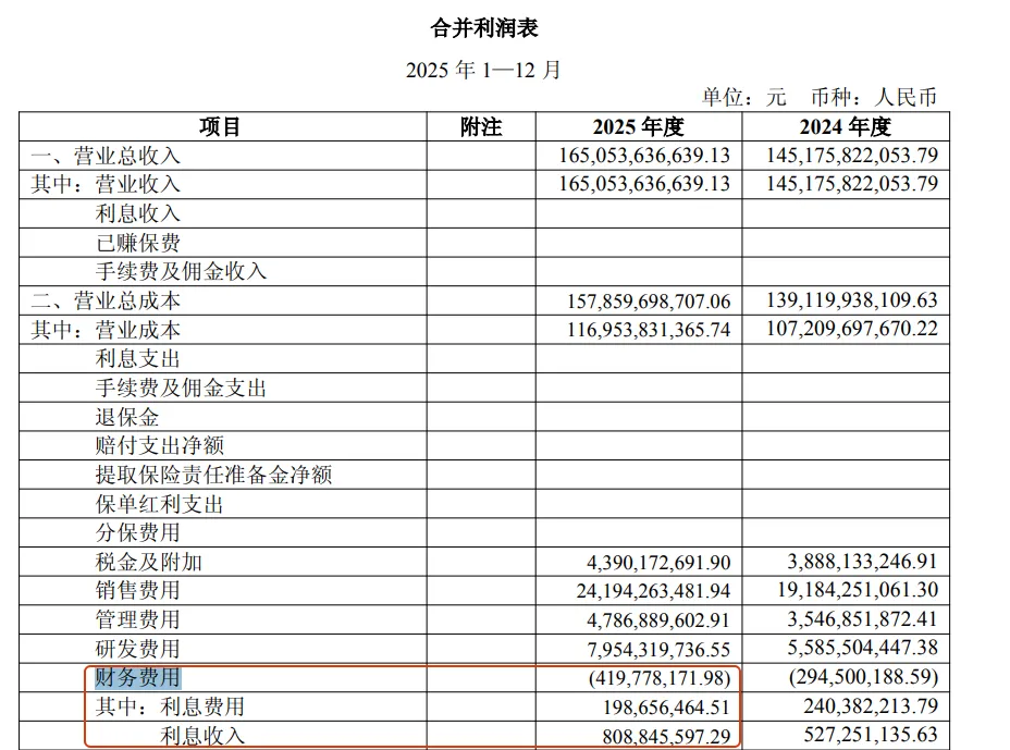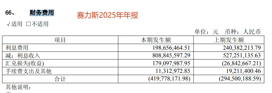 赛力斯2025年报中的财务费用是-4.2亿元怎么理解?