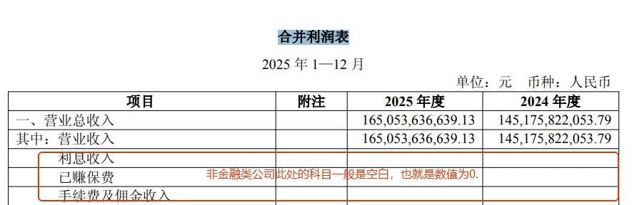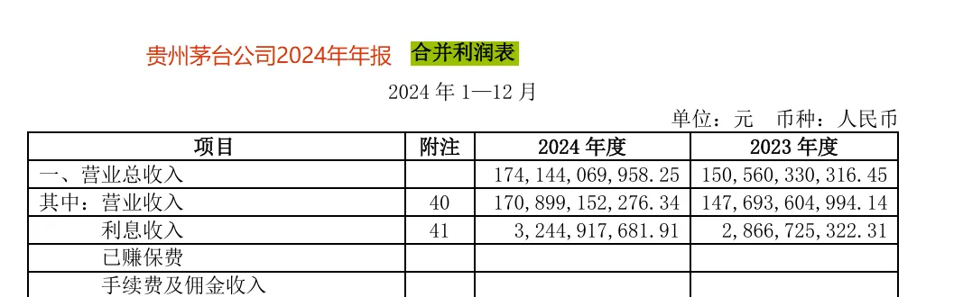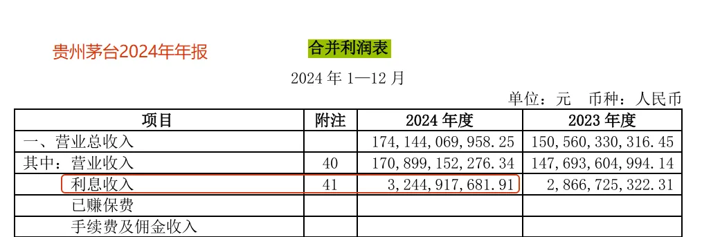 如果大家读过贵州茅台的年报,就会发现它的合并利润表中,「利息收入」等这几项科目数值不为0。核心原因是茅台旗下设有财务子公司,这类子公司属于持牌金融机构,主营业务就是资金运营,因此按照金融企业会计准则,相关利息收入会单独列示在营业总收入项下,而非冲减财务费用(见下图)。