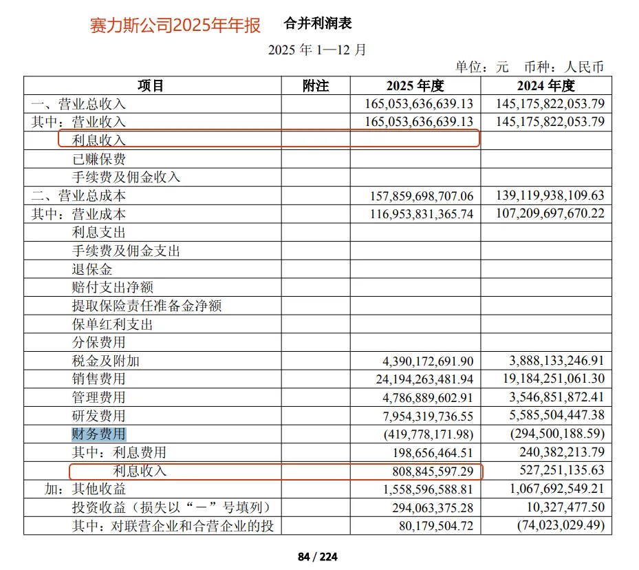 赛力斯作为非金融、非保险类上市公司,其合并利润表中「利息收入」「已赚保费」「手续费及佣金收入」这几项科目,数值自然为0。企业闲置资金存放在银行所获得的利息收入,会在后续的「财务费用」科目下,以二级明细「利息收入」的形式列示,用于冲减当期财务费用(见下图)。