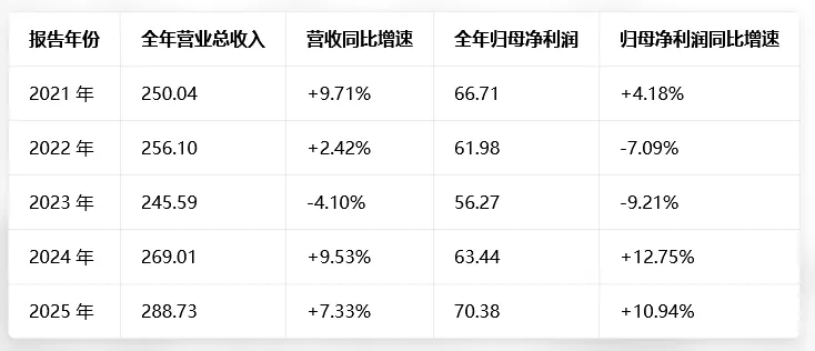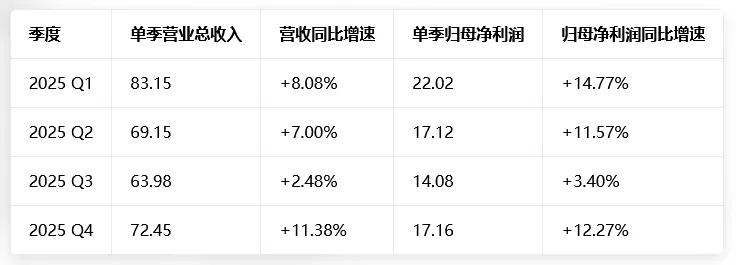 从2020-2021消费股牛之后,消费板块持续下跌了5年多了。有的确实是业绩下滑,有的反而是业绩持续增长的。今天就聊下微哥持有的海天味业,一家业绩持续增长的公司。3月26日,海天味业发布了2025年年报,这是程雪从庞康手中接棒董事长后交出的首份完整年度经营答卷。海天2025年营收288.73亿元,同比增长7.32%;归母净利润70.38亿,同比增长10.95%;扣非净利润68.45亿元,同比增长12.81%。第四季度营收72.45亿元,同比增长11.38%;归母净利润为17.16亿元,同比增长12.27%;扣非净利润16.9亿元,同比增长16.27%。我们可以看到,四季度营收和净利润都是两位数增长,而且环比也是加速的。净利润增速快于营收增速,是因为毛利率达到41.78%,较2024年同期提升3.15个百分点。销售净利率达到24.38%,同比提升0.8个百分点。毛利率提升高于净利率,主要是销售费用和管理费用同比提升有20%左右。对于这个业绩增长,微哥还是很满意的。当下的消费环境,大家也都感受到了。而且相比主营业务都是酱油的其它上市公司(厨邦和千禾年报还没发,只有前三季度),算是逆势增长的。酱油行业老二和老三的日子不好过,老大却还在增长。说明老大在抢老二和老三的市场份额。回首过去5年,海天在2021年营收和净利润降到个位数增长,2022年营收略增。2023年营收出现自公司上市以来首次出现负增长,扣非净利润更是2022和2023年连续两年出现负增长的不利环境下,2024年公司营收和净利润重回两位数增长。2025年营收增长虽未到两位数,净利润增长却到了两位数。可以说是稍作调整,就又回到稳健增长的老路上了。不过未来高速增长也不太可能,大概率是这种低速持续成长。千禾味业因为“海天酱油添加物国内外双标乌龙事件”,主打零添加而受益。2021到2023年营收和净利润持续保持高增长。但是2024年营收和净利润开始略微下滑。今年年报,估计下滑会更明显,也是压力巨大。说明,千禾味业增长开始遇到瓶颈,受益红利已经消化殆尽。也从另一个角度说明,海天也从那次事件的不利影响中走出来了,开始夺回曾经失去的市场,并抢占老二老三的领地。在这种普遍降价的大环境下,规模庞大的海天味业的规模优势就开始展现出来了,出现了强者恒强的马太效应。这一效应在各行各业中都适用。回头看,优秀龙头短期的困难,不是实质性的过失或伤害,股价大跌,是很好的买入时机。业绩发布后,海天股价也在强劲反弹,走出了底部箱体震荡区域。公司形成了“三大核心品类筑牢基本盘、多品类高速增长打造第二曲线”的成熟产品矩阵。公司有7个10亿元级和超30个亿元级产品系列,产品矩阵的丰富度稳居行业第一。酱油、蚝油、调味酱作为公司的传统核心品类,2025年全部实现正增长,合计营收227.19亿元,占总营收的比重达到78.69%,依然是公司业绩的绝对压舱石,且在各自赛道的市占率持续提升。酱油品类:全年实现营收149.34亿元,同比增长8.55%,占总营收51.7%。作为公司的第一大品类,海天酱油已连续27年稳居全国销量第一,2025年市占率提升至20%以上,远超第二名5%左右的市占率,行业绝对龙头地位无可撼动。而且酱油品类的结构升级有突破:全年有机、薄盐、无蔗糖等营养健康系列产品营收同比增长48.3%,高端产品占比持续提升,带动酱油品类毛利率同比提升4.03个百分点至48.73%,创下近五年新高。拆分量价来看,2025年酱油品类销量同比增长8.8%,均价同比微降0.2%,意味着营收的增长主要来自销量的扩张,在行业价格战的背景下,公司没有通过降价换取增长,反而实现了销量的稳步提升与产品结构的升级来增长。蚝油品类:全年实现营收48.68亿元,同比增长5.48%,以超50%的市占率稳居行业第一,领先第二名李锦记超30个百分点,在蚝油赛道形成了绝对的垄断优势。毛利率同比提升3.29个百分点,毛利率达到36.98%。作为海天味业过去十年打造的第二大单品,蚝油品类已完成了从南方市场向全国市场的全面渗透,在下沉市场的渗透率持续提升。调味酱品类:全年实现营收29.17亿元,同比增长9.29%,增速领跑三大核心品类,毛利率同比大幅提升7.61个百分点,毛利率达45.05%。过去市场普遍认为海天调味酱品类增长乏力,难以与老干妈等品牌竞争,但2025年公司通过产品创新与渠道适配,实现了品类的持续增长:火锅底料、拌饭酱、黄豆酱等新品持续放量,针对餐饮渠道定制的大包装调味酱产品销量同比增长18.7%。其他品类:食醋、料酒、复合调味料、鸡精鸡粉等其他品类,合计实现营收46.8亿元,同比增长14.55%,增速跑赢核心品类,占总营收的比重从 2024年的15.2%提升至16.21%,成为公司业绩的第二增长曲线。渠道是调味品企业的生命线,海天味业之所以能够穿越多轮行业周期,核心就在于其构建了行业内最完善、最深、最广的渠道网络。2025年,公司在持续深耕线下渠道的同时,彻底补齐了线上渠道的短板。线下渠道依然是海天味业的核心根基,2025年实现营收257.6亿元,同比增长7.85%,占总营收的比重达到89.2%,在行业线下渠道普遍承压的背景下,依然保持了稳健增长。公司已在全国构建了超7000家经销商、超1000万个终端销售网点的渠道网络,覆盖了全国所有地级市、98%以上的县级市场,渠道下沉深度稳居行业第一。分渠道类型来看,餐饮渠道是公司的核心优势赛道,是最大基本盘,营收占比超60%。尽管2025年餐饮行业整体复苏节奏不及预期,但公司餐饮渠道营收依然实现了8.12%的同比