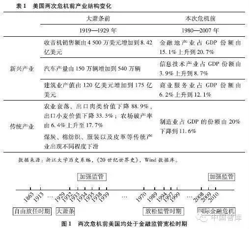 1.两次危机的共同背景是都在重大的技术革命发生之后。长周期理论认为,技术创新引起繁荣,繁荣又是萧条的原因,重大的技术革命引起大繁荣,毫无疑问也会引起大萧条,这是历史周期率的重要表现。1929年爆发的大萧条是在第二次技术革命后发生的,而这次危机则发生在“第三次浪潮”之后①。重大的技术革命总是使生产力得到极大程度的解放,这不但改变着生产函数和产生“毁灭”的创新效应,而且每次技术革命都对社会结构、地缘政治、国家力量对比产生深远而根本性的影响。如果生产关系调整滞后于技术创新后生产力的发展,上层建筑调整滞后于经济基础变化,潜在的危机风险必然加大。对这个问题,著名经济学家熊彼特做出过十分到位的描述,康德拉季耶夫也做过大量研究。所不同的是,从技术革命发生到产生危机的时间大为缩短,1870年以后发生的电力技术革命到发生1929年的危机间隔了60余年,而1980年以后发生的信息技术革命与本次金融危机之间只隔了30余年。其警世意义在于,今后当重大的技术革命发生之后,不仅需要认识它的进步作用,抓住它带来的机遇,同时也要充分意识到重大变革会随之出现,充分估计震动性影响和挑战。(①以电力技术的广泛应用为驱动力的第二次技术革命开始于1870年,到“二战”结束。以电子计算机、原子能技术、航天科技为驱动力的“第三次浪潮”开始于1945年,1978年IBM推出个人计算机,开启了以信息技术的广泛应用为驱动力的信息和新经济革命。)