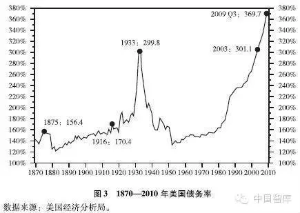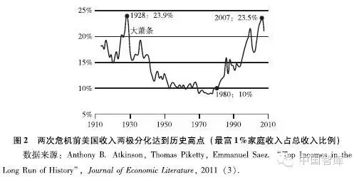 2.在危机爆发之前,都出现了前所未有的经济繁荣,危机发源地的政府都采取了极其放任自流的经济政策。1929年大萧条之前,柯立芝总统实行了以放任自流著称的经济政策,政府对市场经济的运行基本保持缄默,金融利益集团也对放松监管、推动金融自由化发挥了巨大影响。在此期间,新技术的推广和应用首先集中在电力行业和汽车行业,自由竞争使主要行业的产业集中度和垄断程度大幅度提高,劳资对立由于经济繁荣得到一定缓解,而弱势的农业相对衰退,埋下了产业失衡、收入分配差距扩大和经济投机性增强等种种隐患。但不管怎样,经济的放任自流政策创造了著名的“柯立芝繁荣”。在本次金融危机发生之前,在强大的产业和金融利益集团作用下,从克林顿到小布什政府也都采取了经济自由化的政策,在某种程度上,其实际的经济放任程度和对监管的放松接近甚至超过里根政府的做法。在此期间,新技术的推广应用使信息通讯产业和互联网经济得到快速发展,房地产业的繁荣已经出现,美国经济确实出现了人类社会有史以来最长久的繁荣,人们乐观地认为,由于互联网技术的发展,传统的商业周期已经不复存在。在两次繁荣期间,经济的自由放任和企业家创新精神的发扬互为补充,推动着经济的高增长,但也与后来危机的发生存在某种逻辑关系。十分明显的是,发达国家已经出现了制造业的衰落,越来越多的劳动者已经无法适应产业结构的快速变化,过度负债的经济模式已经充满风险(见表1、图1)。3.收入分配差距过大是危机的前兆。两次危机发生前的另一个共同特点,是较少数的人占有较多的社会财富(见图2)。大萧条期间所表现出的,是私人占有和社会化大生产之间的矛盾,表现形式是实体经济产能过剩和有效需求不足。这一次危机则与全球化、互联网和知识经济的发展、经济虚拟化程度提升、不同国家人口结构的变化有更多关系。但最突出的表现是,生产资料名义所有权和实质支配权分离,权力集中到虚拟经济领域极少数知识精英手中。分配差距也不仅表现在一个国家内部不同的社会群体之间,而且表现在传统的发达国家和新兴市场国家之间。在全球化和互联网全面发展的过程中,世界经济形成了相互依赖的三角形循环,新兴市场国家成为全球制造中心,资源富足国家提供原材料和能源,发达国家通过负债消费,拉动新兴市场国家产能利用。虽然形式上的变化很多,但是产能过剩和有效需求不足的矛盾仍然是主要矛盾。4.在公共政策空间被挤压得很小的情况下,发达国家政府所采取的民粹主义政策通常是危机的推手。技术变革和分配差距扩大造成的心理压力,往往会引起社会公众的不满,在执政期内无力改变现状和选票政治的推动下,政府倾向于更多地采取民粹主义政策宣示,安抚民心。上次危机美国总统作出“每家的后院有两辆汽车、每家的锅里炖着一只鸡”的承诺;而这次危机发生前,两任总统都承诺提高住房自有率①。欧盟国家从20世纪90年代末以来,税收占GDP的比重持续下降,但社会福利支出占GDP的比重持续上升,社会福利安排出现过度化倾向,但绝大部分政治家难有决心和胆量压缩福利。民粹主义承诺改变了大众的福利预期,加大了对政府的依赖,也放松了自己的奋斗决心,是效果极其负面的腐蚀剂。致命问题是,一旦大众的福利预期得不到满足,社会心理很快发生逆转,并形成蔑视权威、拒绝变革和仇视成功者的强烈氛围。与此同时,超出收入能力的过度财政负债和福利主义相应成为一种习惯,这种习惯在政府和民间相互影响,其破坏力在目前的欧债危机中得到充分体现。对这个问题,桥水投资基金的戴利欧先生在“和谐的去杠杆化”一文中,对政府和民间的去杠杆化过程做了精彩描述。文章认为,每隔70年左右的一次高负债都伴随着一次经济危机(见图3),在这期间工资增长都超过劳动生产率的增长,负债增长都大大超过税收能力。(①在1995年美国住房与城市发展部发布的《国家住房战略》中,克林顿提出:“要实现住房自有率在本世纪末达到历史最高水平”。2004年10月小布什在华盛顿竞选连任的演讲时提出:“任何一个家庭搬进自己拥有的房子都会感到美国比其他国家强”。)5.大众的心理都处于极端的投机状态,不断提出使自己相信可以一夜致富的理由。两次危机前的产业神话和收入分配出现的巨大差距,往往导致资本主义制度下的社会心理状态出现变异。改变其社会地位的急切心情,使大众都开始追求一夜暴富,人们宁愿相信各种投机奇迹,人类本性中的贪婪和健忘达到前所未有的程度,没有多少人可以经受泡沫产业的诱惑,社会心态浮躁具有普遍性。在宽松货币环境和以提高杠杆率为实质的金融创新助推下,大量举债进行高风险投机,产生了巨大的资产泡沫,大萧条前主要是股市泡沫,这次危机前是房地产泡沫。正如加尔布雷思所描述的,当经济处于过度繁荣状态的时候,没有人不相信泡沫会继续膨胀,人们不是找出理由使自己理性,而是找出理由使自己相信盲目冒险的正确性。可以肯定的是,在特定的历史阶段和制度条件下,人类这种自我膨胀的说服力量和缺乏理性是导致危机的重要原因。由此我们也可以提出一个相关的质疑:经济学关于理性人的假设是否具有永恒性?