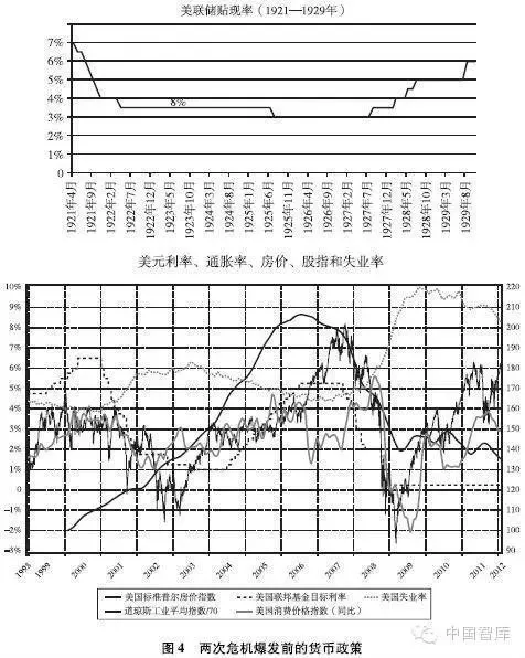 6.两次危机都与货币政策相关联。在两次危机之前,最方便的手段是采取更为宽松的货币信贷政策。大萧条前,泛滥的信贷政策引起了股市的泡沫和投机的狂热;在这次危机前,美联储极其宽松的货币政策、金融放松监管和次级贷款都达到前所未有的水平,使得经济泡沫恶性膨胀。在经济泡沫导致消费价格上涨的压力下,货币当局不得不采取紧缩货币政策,从而捅破了泡沫,改变了投机者的心理预期,使得迟早发生的事终于发生(见图4)。两者的主要区别在于,1929年大萧条还没有明确的宏观经济理论指导,而本次金融危机则是宏观经济政策长期服从于政治选举目标。两者的共同之处在于,货币当局对宏观经济形势都缺乏准确的理解,大萧条时期美联储的决策者基本没有总需求管理的意识,而这次美联储则对已经全球化的世界经济与美国作为储备货币国所应该执行的货币政策认识很不到位。7.危机爆发后,决策者总是面临民粹主义、民族主义和经济问题政治意识形态化的三大挑战,市场力量不断挑战令人难以信服的政府政策,这使得危机形势更为糟糕。在面对严重危机的时候,主要国家在应对政策上总犯同样的错误,特别是应当采取行动的时候总会错过时机,应当采取宏观扩张政策的时候则采取紧缩政策,应当开放和进行国际合作的时候往往采取保护主义政策,应当压缩社会福利、推动结构改革的时候却步履艰难甚至反复和倒退①。这些明显的错误在事后看起来显得可笑,但对当事人来说,实施正确的政策却困难重重。这是因为,大危机在人的一生中往往仅会遇到一次,决策者缺乏经验,又总是面临民粹主义、狭隘的民族主义和经济问题政治化这三座大山,政治家往往被短期民意绑架、被政治程序锁定和不敢突破意识形态束缚,这几乎是普遍的行为模式,这一点在最近的希腊危机中表现得最为明显。同时,在市场大幅波动中获益是大金融资本的逐利本性。在一些国家软弱的政府政策面前,国际金融市场力量往往起到“树欲静而风不止”的作用,这种力量又与在野的政治力量相结合,使得当政者处境岌岌可危。特别需要强调的是,两次危机中的市场力量从来都是高度政治化的力量。如果仅从经济角度认识问题而忽视其政治属性,就会犯重大的判断性错误。(①2012年欧债危机持续发展,法国、希腊、西班牙等国的民意普遍左转,民族主义和极左、极右势力明显抬头,大选之年政府不得不迎合民意,许多有利于债务问题解决的政策难以实施,欧债风险迅速上升。)