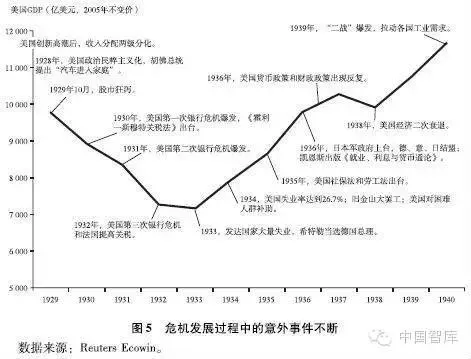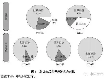 8.危机的发展有特定的拓展模式,在它完成自我延伸的逻辑之前,不可轻言经济复苏。在经济危机的过程中,会发生很多意外事件,它们似乎是一些小概率事件,由运气决定。但事实并非如此。经济一旦从正常状态转入危机状态,它就开始以一种不同寻常的方式循环。危机往往从经济大幅跳水开始,由泡沫破裂走向失业率攀升,由经济困境加重转向社会矛盾激化,由经济社会领域转向政治领域乃至军事领域。在这个过程中,政府面对超高的负债率,先是在财政上采取紧缩政策,去杠杆化进程开始;随后经济泡沫破裂所带来的经济压力往往通过货币贬值和债务重组得以缓解;而后,在经济未实现好转之前,通胀上升和股市繁荣往往带来一次虚假复苏,但很快会遇到经济的二次探底;在1929年的大萧条中是这样,在这次国际金融危机中已经出现了这种迹象:美国金融危机一度出现缓解,但欧债危机却出乎意料地全面恶化,系统风险迅速上升,全球经济可能由此进入第二轮危险期。同样,当国内矛盾激化到一定程度之后,就会向外部转移和推卸责任。危机的自我拓展只有走完全过程才能达到新的平衡点,大危机一旦发生就注定是一个较长的过程。上次大萧条最极端的情况是希特勒通过民选方式上台和第二次世界大战爆发。当前特别需要重视的是,在危机自我逻辑实现的过程中总会出现意外事件,一连串的失控和误判也屡屡发生。目前,欧债危机正在深化,中东形势很不确定,经济、政治、社会、历史、文化等方面的冲突相互交织,在这种情况下,我们对本次危机可能出现的重大风险必须有充分的思想准备(见图5)。9.危机只有发展到最困难的阶段,才有可能倒逼出有效的解决方案,这一解决方案往往是重大的理论创新。大萧条后,世界在绝望中发生了凯恩斯革命。在这次危机中,虽然凯恩斯理论再一次获得生命力,但人口老龄化、全球产能过剩、资源约束强化所导致的潜在生产能力下降,加上劳动力市场更加“粘性”,使单纯扩张总需求的政策撞到天花板。同时,全球通缩压力、欧洲主权债务恶化等导致的负面效应显现,全球经济又一次进入十分困难和复杂的境地。前一段兴起的心理学、经济学和政治学相结合的不少研究引人注目,目前兴起的关于国家资本主义的呼声提高,这说明全球都在等待着理论创新。这次理论创新可能围绕全球经济最实质和困难的问题展开:世界出现的总需求萎缩和资本、技术与劳动力在全球宏观配置失衡的局面,加上一些国家的经济增长陷入绝境,既带来本国的社会政治问题,也快速向全球传染,怎样解决这个问题尚无明确思路。在经济全球化条件下,单个国家解决这些问题的能力明显不足,而大国相互合作又如此困难,急需提出一个可行方案,解决这个全球性的复杂问题。我们看到,全球经济的恶化又一次产生巨大的倒逼力量,这在曾经的欧盟峰会上已经体现出来。同时还要看到,尽管理论创新十分重要,但全球经济能否走出危机,又在很大程度上取决于外部运气因素,这在1929年大萧条的末期表现得十分充分。10.危机具有强烈的再分配效应,它将导致大国实力的转移和国际经济秩序的重大变化。“基辛格定律”可能被再次验证。基辛格在他的名著《大外交》一书中开宗明义地指出,世界每隔百年会出现一个新的全球大国。这个判断可能被两次危机所证实。大萧条后世界经济重心由欧洲转向美洲,美国在世界经济中发挥主导作用,美元占据支配地位,联合国、国际货币基金组织和世界银行诞生,世界经济政治格局发生重大变化。这次危机发生后,全球发展的重心向亚太地区转移,二十国集团(G20)平台产生,世界实力对比正在急剧变动,国际经济秩序正在发生变化。从这个意义上看,危机不仅具有对生产力发展的破坏作用,也有积极的创新作用,更有强烈的再分配效应。总之,大危机所分配的不只是一个国家国内的财富,而且是国家之间实力的对比。危机的再分配效应是无法抗拒的,世界经济秩序将继续发生稳步但不可逆转的重大变革(见图6)。两次危机的比较研究,使我们得到不少思想收获,也受到很多启示。考虑到我国加快推动经济发展方式转变、全面建成小康社会的历史背景,在诸多可以选择的政策建议中,这里主要想提出三点思考。