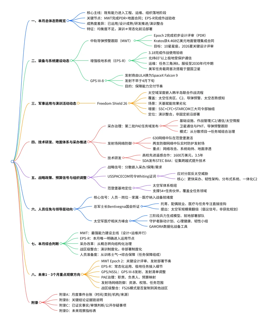 报告最有价值的地方,是抓住了三个真正影响后续判断的问题:MWT与EPS-R分别推进到了哪一步;采办改革和发射场网络防御是否已开始制度化;太空域嵌入韩半岛联演,究竟意味着能力成熟,还是主要仍属于演训层面的制度试验。这样的处理比一般资讯汇编更有分析密度。