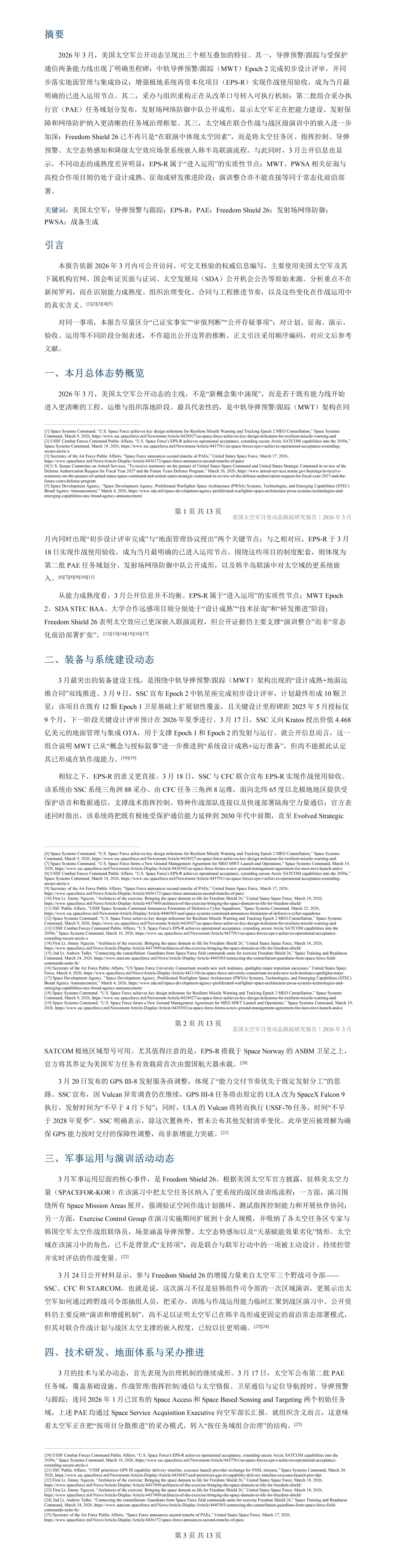 该报告《美国太空军月度动态跟踪研究报告(2026年3月)》约0.9万字,共12页,围绕2026年3月1日至3月31日美国太空军公开动态展开梳理,重点覆盖装备与系统建设、军事运用与演训、技术研发与地面体系、采办推进、战略政策与组织调整、人员与领导层动向等内容。报告认为,本月最值得关注的并非概念性新项目,而是若干既有能力线进入更清晰的工程和运用阶段:中轨导弹预警/跟踪(MWT)Epoch 2完成初步设计评审,Kratos获得地面管理与集成OTA,EPS-R实现作战使用验收;同时,PAE任务域划分、发射场网络防御中队公开成形,以及Freedom Shield 26中太空任务区深度嵌入联演流程,也显示太空军正在把能力建设、发射保障和战区运用进一步压缩到同一条能力生成链上。