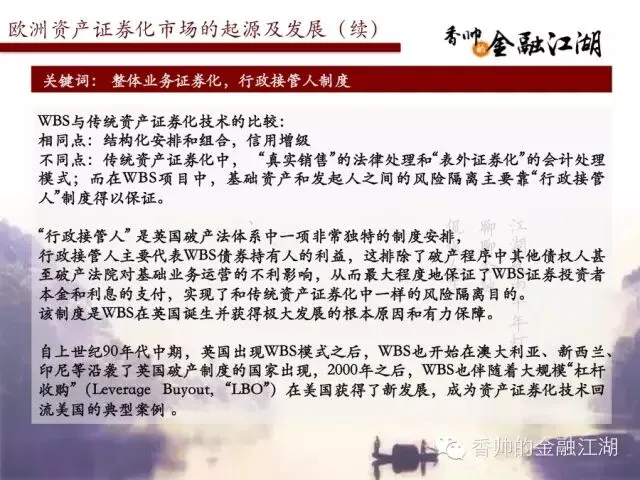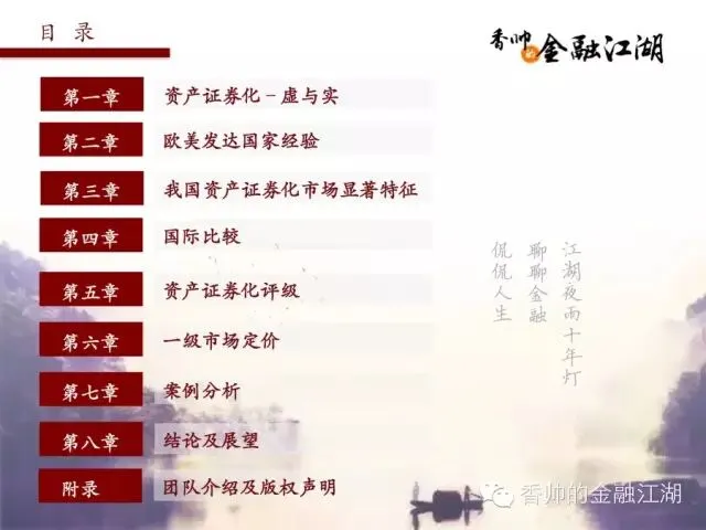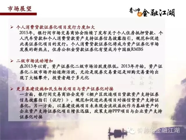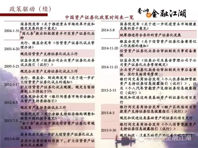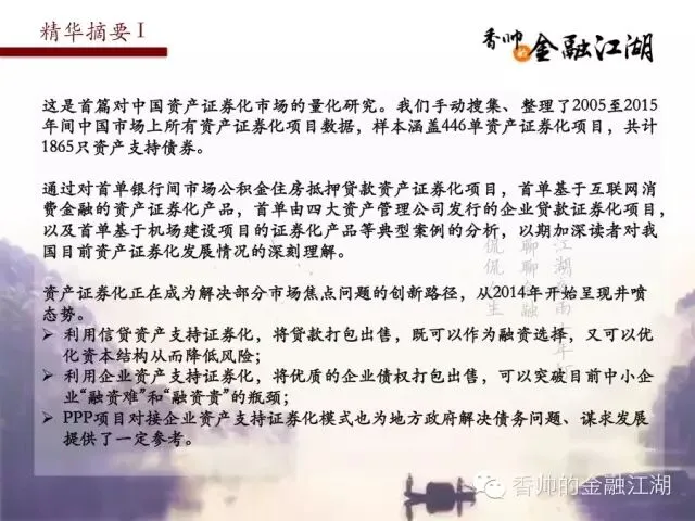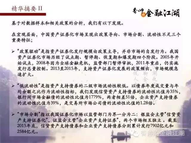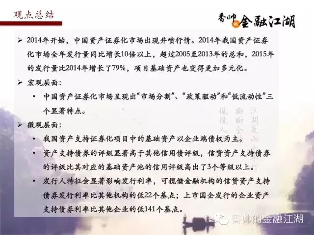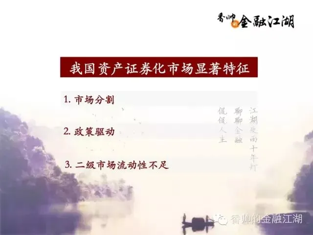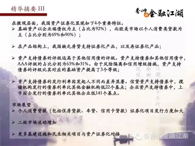 报告很长(3万多字),我们摘取了一些主要内容编制了一个PPT简略版。大致上看,中国资产证券化市场呈现出三个特征。