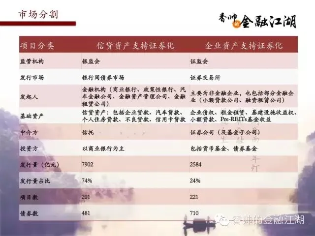 第二是“市场分割”(被人为分割成银监会主管的信贷资产证券化和证监会主管的企业资产证券化,虽然对于已经发行过的产品来说,这两个名词是非常不准确的);