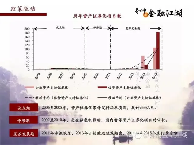 在所有的金融创新中,资产证券化是一个重要方向。从2014年开始,中国的资产证券化市场突然出现井喷。从2005年建设银行发行第一单资产证券化项目开始,到2013年底我们一共只发行了55单,累计1532多亿元产品。而2014年一年就发行了89单,共计3290亿元。2015年市场继续发酵,发行量比2014年进一步增长79%,发行品种更加多元化。2016年2月17日,八部委联合发布《关于金融支持工业稳增长调结构增效益的若干意见》,提出稳步推进资产证券化发展,推动个人消费类贷款证券化项目、企业应收账款证券化项目和不良贷款证券化项目的发行,在政策层面保证了资产证券化市场的继续扩容。