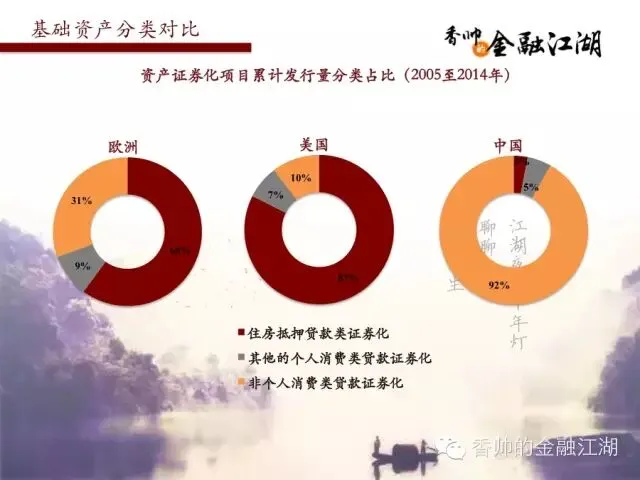 此外,我们还发现中国资产证券化的基础资产以企业端债权为主(占比为92%),而欧美市场以个人消费类贷款为主(占比分别为69%和90%),从发行趋势看,以个人消费来贷款为基础资产的资产证券化将成为受欢迎的主流产品(最近热销的阿里小贷和京东白条的产品就说明了这一点)。