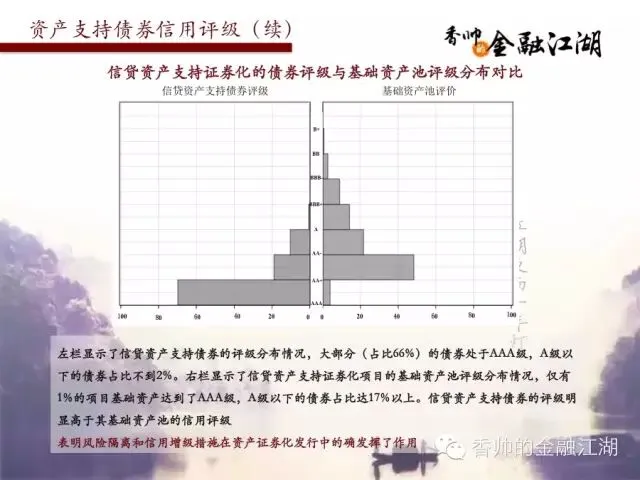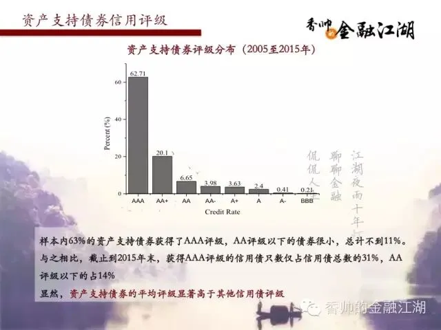 另外呢,从信用评级的角度看,我国资产支持债券的评级远高于其他信用债的评级,证明迄今为止,我们所发行的产品都是较为优良的资产(这个不难理解,在交易不活跃的情况下,优良资产都不好卖,更别说不良资产了。所以监管层想在用资产证券化来消化银行不良贷款的设想能否实现,真的未可知)。