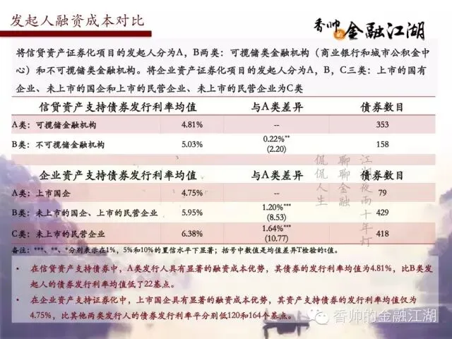 最有意思的是,资产支持债券的发行利率因发起人不同而存在显著差异。信贷资产支持债券中,揽储机构(商业银行和住房公积金中心)发行的债券利率比其他金融机构低22个基点;企业资产支持债券中,上市国企发行的债券利率比其他企业低141个基点。不同类型企业融资能力的不同,在这个市场上非常明显,所以我们的信贷政策要起到”定点注射”的效果,可能真的应该对企业的类型和融资能力做更加细致的研究。
