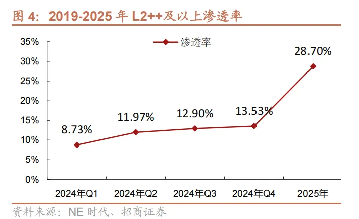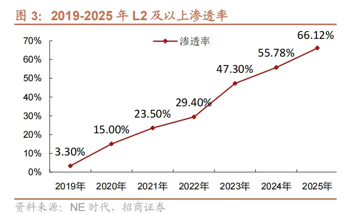 辅助驾驶正在从低阶向高阶快速渗透,L2++及以上渗透率不断提升。伴随着“供给端降本(域控/激光雷达)、算法范式迭代(端到端/VLA/世界模型)、政策推进(L3 准入试点)、消费端认知与支付意愿提升等因素,L2 及以上辅助驾驶已成“新常态”。据NE时代统计数据,2025年全年L2 及以上辅助驾驶车型销量累计达1515.37 万辆,渗透率达66.12%,较2024 年增长超过10 个百分点。其中L2++及以上车型销量累计达657.75万辆,占L2及以上辅助驾驶车型总量的43.41%,L2++及以上渗透率达28.7%,较2024年增长超过15个百分点。2025年“L2及以上”跨越 60%后,高速/城市NOA进入普及拐点,随价格带下沉与端到端/VLA/世界模型上车,2026 年“高阶智驾”渗透具备较强确定性。