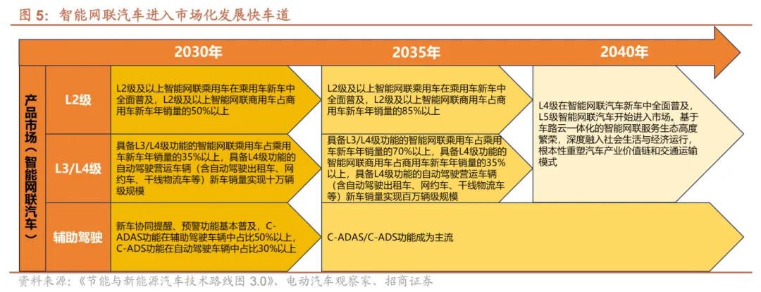 未来5-15年,智能网联汽车(L2+、L3和L4)进入市场化发展快车道。根据2025 年10月发布的《节能与新能源汽车路线图3.0》,预计2030 年乘用车L2级及以上智能网联乘用车在乘用车新车中实现普及,L3/L4 级渗透率超35%,具备L4 级功能的自动驾驶营运车辆(含自动驾驶出租车、网约车、干线物流车等)新车销量实现10 万辆级规模。到2035 年L3/L4 级渗透率将达到70%以上,具备L4 级功能的自动驾驶营运车辆(同上)新车销量实现100万辆级规模。到2040年,L4 级在智能网联汽车新车中全面普及,L5 级开始进入市场。