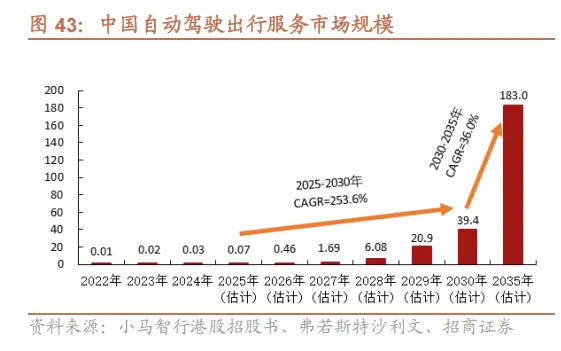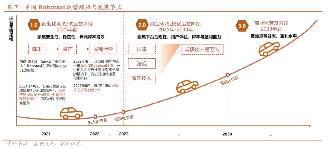第一阶段为商业化测试、试运营阶段:2025 年之前是Robotaxi大规模商业化的基础积累期,这一阶段大部分车辆需配备安全员,安全员可在必要时接管车辆。技术研发侧重于对复杂路况的适应性和“长尾场景”的处理,到2025 年部分企业已经实现规模化运营,行业实现从测试/试运营向规模化发展的过渡。