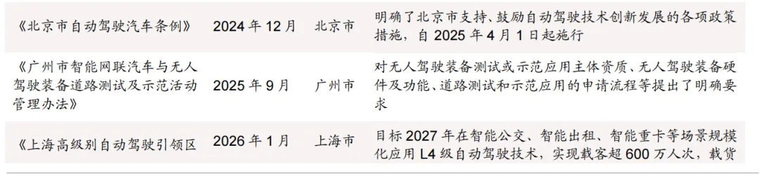 中美两国作为行业领跑者,政策支持力度持续加码。中国从国家层面明确L4 级车辆可用于商业运输,并推动“车路云一体化”试点。2025年8月,中国《自动驾驶汽车道路测试与示范应用管理方法(2025 修订版)》正式生效,明确上海、广州、深圳、重庆、杭州五城全域开放L4级收费运营,取消安全员强制要求,并建立技术缺陷责任分级机制,为RoboTaxi的商业化运营扫清了关键障碍。美国则在联邦安全框架与各州自主许可的并行体系中,逐步放宽运营限制,推动无方向盘车型商业化,共同加速自动驾驶技术的规模化应用。