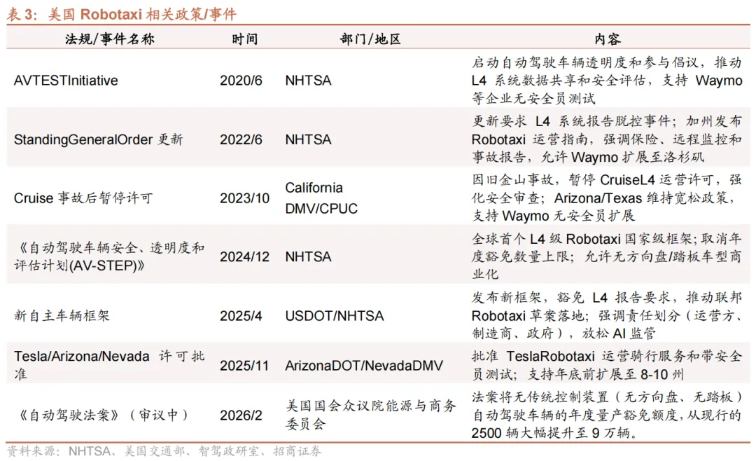 特斯拉于2026 年1月22日正式开始在奥斯汀Robotaxi 移除车内安全员,但目前数量较少、进展缓慢;Waymo 全美Robotaxi 车队规模已达3000 辆主要分布在亚特兰大、奥斯汀、洛杉矶、迈阿密、菲尼克斯和旧金山湾区六个市场,并正向达拉斯、休斯顿、圣安东尼奥和奥兰多四个城市加快扩张。
