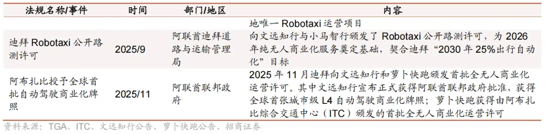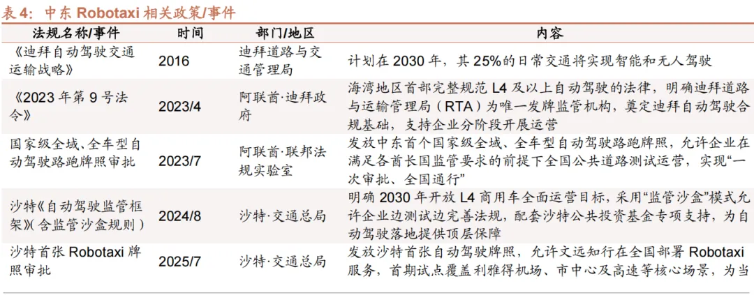 阿联酋及中东地区自动驾驶加速推进,其中迪拜目标“2030 年25%出行自动化”。中东相关Robotaxi 政策从2023 年阿联酋发放中东首个国家级全域、全车型自动驾驶路跑牌照、迪拜出台L4 规范起步,一系列政策以全国性牌照降低企业跨区域成本,让中东成为自动驾驶商用的核心试验场。具体国家来看,沙特发放首张牌照、迪拜明确“2030 年25%出行自动化”、阿布扎比开启纯无人商业化运营,多国正加速落地L4 级测试及运营。