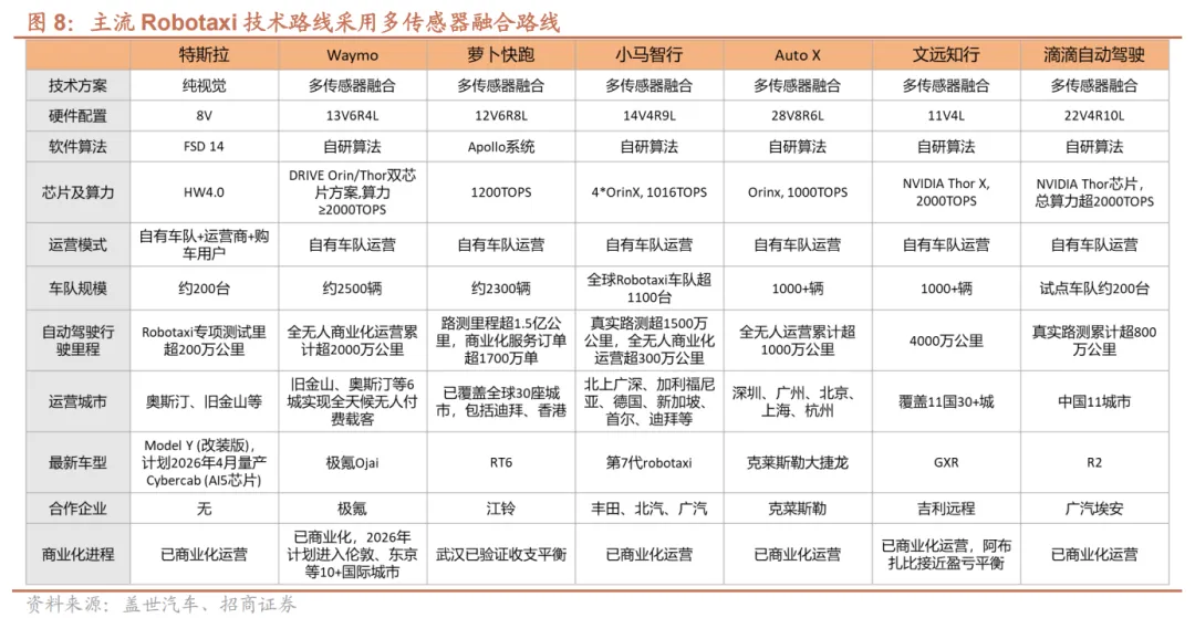 小鹏汽车进入前装量产和试点运营的倒计时阶段,2026年试运营节点明确。2025年小鹏汽车科技日,宣布将在2026年推出三款Robotaxi车型,同时还将启动Robotaxi 试运营。小鹏Robotaxi 是专为L4 级无人驾驶而设计生产。在硬件上,小鹏Robotaxi 搭载4 颗图灵AI 芯片,车端算力高达3000TOPS,是目前全球最高水准。技术路线方面,小鹏Robotaxi不依赖激光雷达与高精地图,依托纯视觉方案即可应对全球不同道路类型及交通环境,这意味着它有很强的泛化性。在生态构建方面,高德地图已成为小鹏首个全球生态合作伙伴,未来用户可直接在高德App内呼叫小鹏Robotaxi,小鹏则借助高德的流量和运力调度网络快速启动服务。