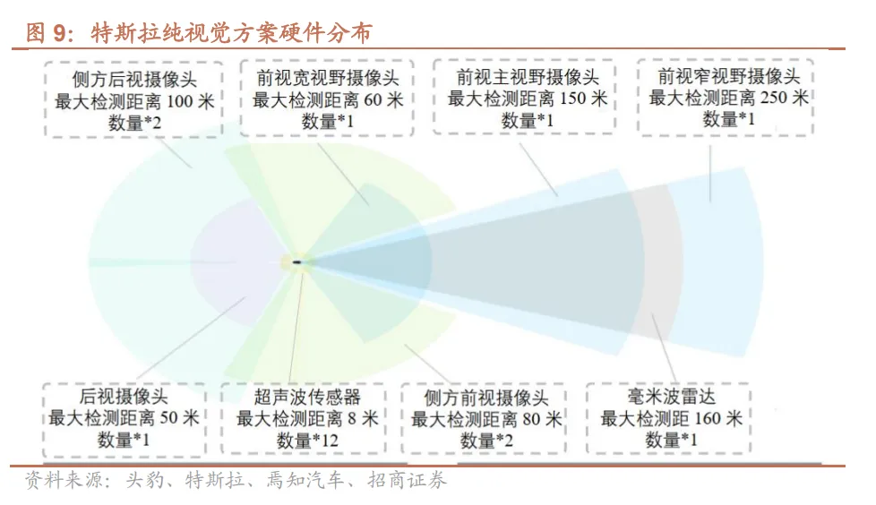 特斯拉的纯视觉方案具备较好的成本优势,使其能搭载于3-6 万美元的量产车型(如Model3/Y)。特斯拉的单车智能系统以“8摄像头+12超声波雷达+1毫米波雷达+高算力芯片”为硬件基础,摒弃了激光雷达的高精度三维建模能力,转而通过计算机视觉算法模拟人类驾驶时的“视觉-大脑”决策过程,纯视觉方案的核心优势是“成本控制与规模化”,且统一摄像头感知避免多模态融合冲突与同步问题,适配不同车型与场景的复制效率更高。其技术底层逻辑包括: