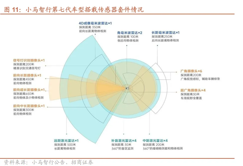 小马智行第七代Robotaxi 全车搭载6大类34 个传感器,多重系统冗余架构也能全面保障运营期间车辆和乘客的安全。第七代Robotaxi车型搭载六类量产传感器,包括9 颗激光雷达、14 颗摄像头、4 颗毫米波雷达,以及4 颗麦克风、2颗涉水传感器和1 套碰撞传感器,实现车周360°无盲区、650 米范围内的物体和环境检测。该传感器方案配备小马智行自研传感器清洁方案,更好地检测和应对长尾场景,让自动驾驶车辆实时掌握复杂路况,满足Robotaxi应对城区、高速、环路路段,雨、雪、雾等恶劣天气,以及“鬼探头”、避让救护车等的全场景无人驾驶通行能力和安全性要求。