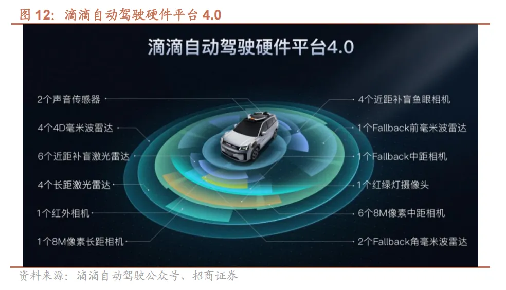 滴滴自动驾驶4.0平台将搭载于其与广汽埃安联合打造的L4级Robotaxi车型。滴滴自动驾驶全新一代硬件平台,传感器总数量达33个,通过激光雷达、摄像头、4D 毫米波雷达、红外相机、声音传感器等多传感器异构探测与前融合的方式,能实现360°全场景、全工况感知识别。该计算平台的GPU算力超过2000TOPS,CPU 达48 核,传感器接入能力比上一代计算平台提升一倍。此外,集成度和装配效率显著提升,后备箱可用体积增大88%,成本大幅降低74%,装配效率提升7 倍。