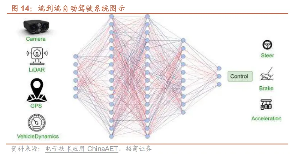 端到端将大幅提升汽车层面的智能化水平,加速智能驾驶发展,并且在一定程度上减少对道路基础设施的依赖。特斯拉率先引领智驾进入端到端时代,我们预计业内众多车企也将布局端到端的技术路线。