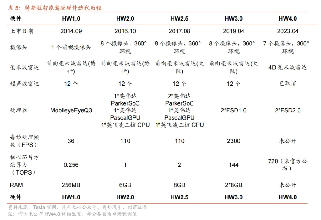 (3)FSD芯片与算力支撑:特斯拉自研的HW4.0计算平台搭载两颗神经网络处理器(NPU),HW4.0相比于HW3.0 实现了5 倍的芯片算力提升,双芯片算力预计可达720TOPS,支撑多摄像头数据的并行计算与决策输出。