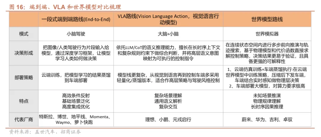 端到端智能驾驶已经衍生出VLA和世界模型两种技术路线。为解决低频场景数据不足和推理能力问题,端到端衍生出VLA和世界模型两种路线,VLA和世界模型并不是完全对立,而是两条目前并行发展的技术路线:VLA适合快速迭代、兼容现有量产平台,短期内易于落地。世界模型则代表了更底层的认知方式,强调物理规律和空间理解力,适合长期演进。各大厂商基于自身的技术积累、成本考量和品牌定位,选择不同的演进策略,部分厂商会同时预研多个技术路线。