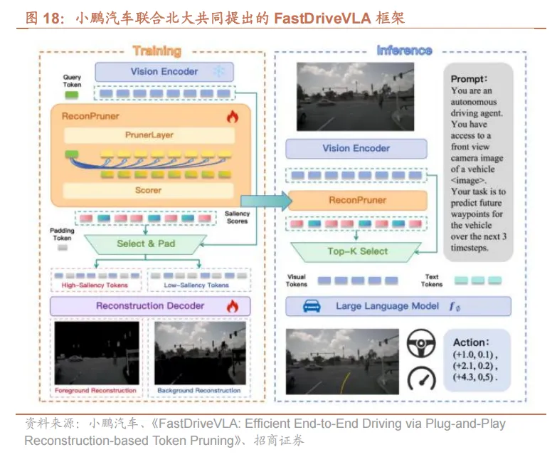 VLA技术正推动自动驾驶从“感知-规划”传统范式向“多模态交互-自主决策”演进。VLA(视觉-语言-动作模型)是一种多模态的机器学习模型,由VLM 模型演变而来,它结合了视觉、语言和动作三种能力,旨在实现从感知输入直接映射到控制输出的完整闭环能力,其不仅关注环境感知,也关注规划与控制问题。VLA模型最初被开发用于解决具身智能中的指令跟随任务,其后这一理念快速应用于自动驾驶领域,相较于“VLM+E2E”的中间态架构,VLA 深度整合了空间感知、逻辑推理、行为规划等多模态信息进行端到端训练,从根本上解决了模型信息传递损耗和不同模型联合优化训练问题,显著提升了模型极端环境下泛化能力和决策能力。国内元戎启行、理想、小米、小鹏等已有了相关进展,其中小鹏已发布第二代VLA 模型,且该模型可跨域驱动汽车、Robotaxi、机器人、飞行汽车。