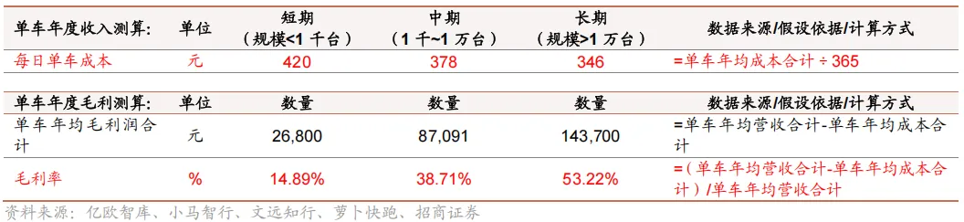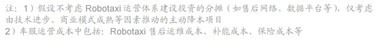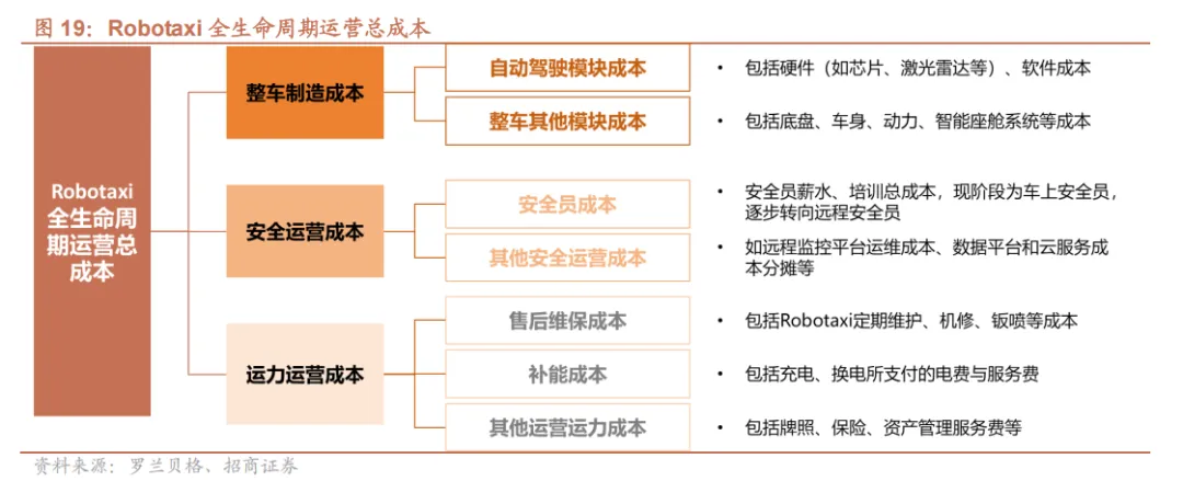 Robotaxi全生命周期运营总成本具体分为三个主要部分:第一部分为整车制造成本,包含自动驾驶模块成本与整车其他模块成本。其中,自动驾驶模块成本涵盖芯片、激光雷达等硬件及软件成本;整车其他模块成本涵盖底盘、车身、动力、智能座舱系统等成本。第二部分是安全运营成本,由安全员成本与其他安全运营成本构成。其中,安全员成本涵盖安全员薪水、培训总成本,现阶段安全员部分为车上安全员,后续逐步转向远程;其他安全运营成本涵盖远程监控平台运维成本、数据平台和云服务成本分摊等。第三部分为运力运营成本,包含售后维保成本、补能成本以及其他运营运力成本。其中,售后维保成本包括Robotaxi定期维护、机修、钣喷等成本,补能成本涵盖充电、换电所支付的电费与服务费,其他运营运力成本涵盖牌照、保险、资产管理服务费等。