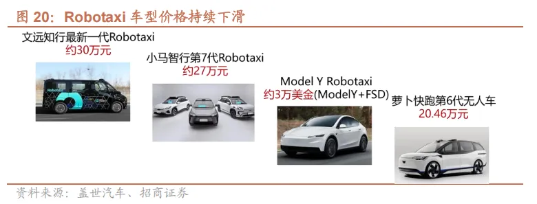 软硬件成本持续下降,为商业化落地创造条件。L4 级Robotaxi 得以大规模落地的关键,与整车制造成本和后端运维成本持续降低显著相关。目前,Robotaxi整车成本已降至20~30万元区间,商业模式逐步拓展,用户接受度持续提升,整体产业进入市场化运营的关键拐点。