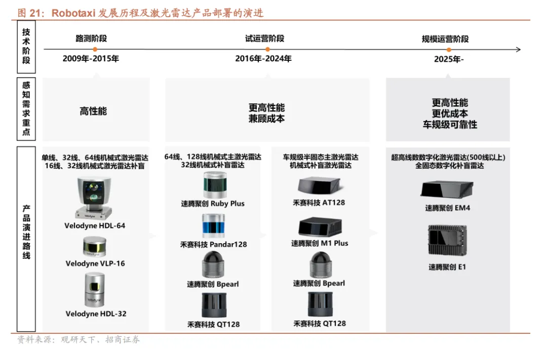 激光雷达市场加速下沉,需求井喷+供给端指数级降本促进激光雷达价格下探,激光雷达成本快速下降助力Robotaxi 单车BOM 成本下降。激光雷达正如半导体芯片一般,呈现出性能持续提升、成本不断下降的趋势。芯片的集成化是激光雷达降本的主要途径,头部厂商纷纷采用芯片级集成和数字化的技术路线,以大幅降低激光雷达成本并提升性能。据盖世汽车数据,2025 年用于L2 级辅助驾驶的主激光雷达价格已降至200 美元(约合人民币1440 元)左右,这一数据在两年前是500 美元(约合人民币3600 元)。