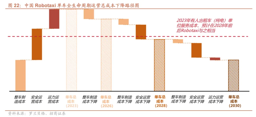 中国Robotaxi单车全生命周期运营总成本呈现不断下降的趋势。2023 年Robotaxi的单车总成本较高,其中包含较高的整车制造成本、安全运营成本及运力运营成本;后续预计2026 年至2030 年单车总成本持续下降:2026 年整车制造成本呈现下降趋势,2028 年呈现整车制造成本、安全运营成本的下降,2030年则进一步展现整车制造成本、安全运营成本、运力运营成本的全方位下降。同时,罗兰贝格预计,2023 年有人出租车(纯电)的单位服务成本,预计在2028年前后与Robotaxi的成本相当。