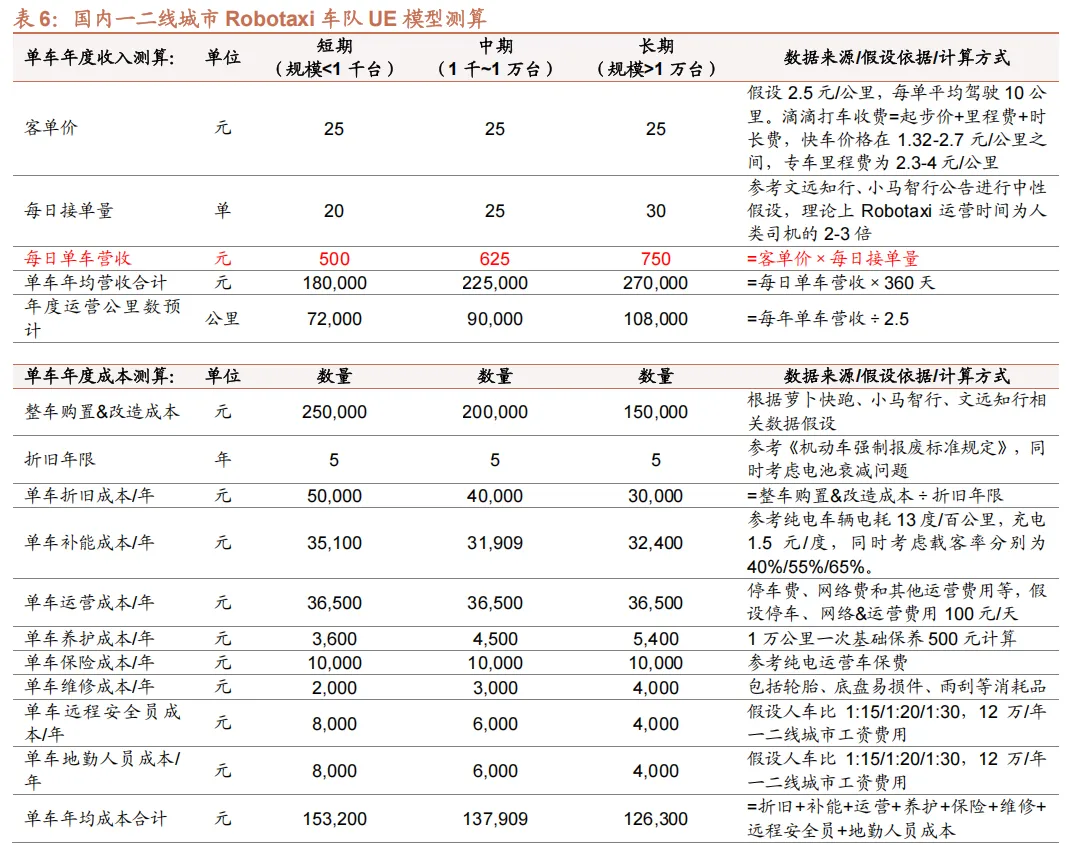 在特定假设下,根据UE 模型测算,预计远期Robotaxi 车队毛利率可达到50%以上。与传统出行方式相比,自动驾驶出租车可节省70%以上的劳动力成本,且L4级自动驾驶出租车的采用预计将大幅降低整体运营成本占营收的比例,促进无人驾驶出租车平台实现可观的毛利率空间。根据UE 模型假设,在中国一二线城市Robotaxi 将快速扩张,我们考虑短期、中期和长期车队规模分别为1千台以内、1 千至1 万台和超过1 万台。假设客单价25 元,随着车辆密度的提升,预计单车接单量呈现明显的提升态势,分别为20/25/30 单/天,促进单车营收不断提升。在成本项,综合考虑折旧、补能、运营、养护、保险、维修、远程安全员、地勤人员等八项主要成本情况下,预计短/中/长期国内一二线城市车队毛利率将达到15%左右/30%以上/50%以上,能给企业带来可观的利润空间。因此,Robotaxi 行业也是规模经济能得到集中体现的行业,在行业大规模商业化阶段,对应公司盈利能力将逐步提升。