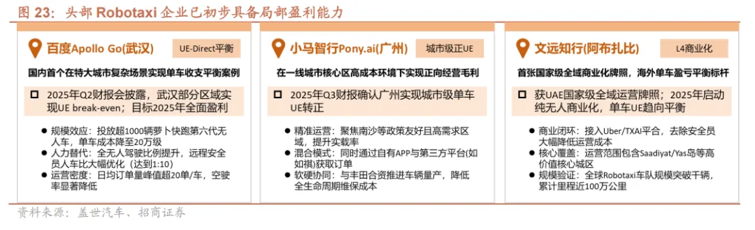 部分头部企业的单位经济(UE)已经在部分城市跑通。随着头部Robotaxi 企业陆续迈入千辆级规模化运营阶段,在部分核心城市已实现单车运营效率与成本结构的优化,初步跑通了在限定区域和单一场景(如城区主干道、固定接驳路线等)下的商业模型,展现出局部盈利能力。其中,百度创始人、董事长兼首席执行官李彦宏在百度2025 年第二季度财报电话会议中明确表示:“在武汉,萝卜快跑已经实现单车收支平衡(UE 盈亏平衡)”;小马智行先后宣布公司第七代Robotaxi在广州和深圳地区实现城市级单车盈利转正;文远知行在2025Q3财报中表示,其与Uber 在阿布扎比的Robotaxi 服务将实现单车盈亏平衡。这标志着行业整体正从以技术可行性验证为主,转向商业化落地与盈利模式验证并行的新阶段,为后续全域扩展和多场景融合奠定基础。
