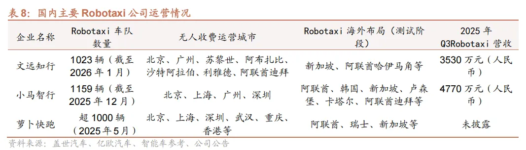 Robotaxi行业呈“中美主导、多强竞技”格局,面对激烈的市场竞争,差异化布局成为企业突围的重要路径。在美国市场,Waymo和特斯拉主导行业竞争,Waymo在美国的已在旧金山湾区、洛杉矶、凤凰城、奥斯汀、亚特兰大等城市投放约2500 辆Robotaxi,规模化与周订单领先全球。特斯拉正加速迈向多城市网络化布局,并即将量产无传统控制装置(无方向盘、无踏板)自动驾驶车辆Cybercab。在国内市场,文远知行、小马智行和萝卜快跑等科技公司为全球化扩张主力,小马智行深耕国内四大一线城市,聚焦核心市场的精细化运营;文远知行则通过多产品矩阵及全球化(在中东、欧洲等地)抢占先机。此外,滴滴和曹操出行等出行平台正加速推进测试和运营,推动车队快速扩容。
