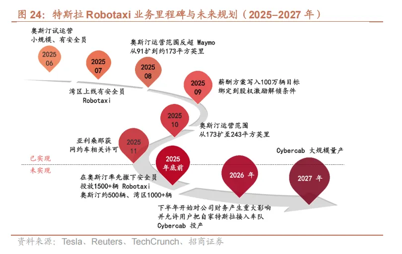 特斯拉Robotaxi 正从单点试运营加速迈向多城市网络化布局。自2025 年6月特斯拉在奥斯汀以约10-20 辆ModelY启动有安全员、付费载客的Robotaxi试运营以来,7月旧金山湾区以同款模式上线,8 月将奥斯汀运营范围从91 平方英里扩展至约173平方英里超过Waymo,10月进一步扩区至约243平方英里,覆盖领先Waymo;9 月“100 万辆Robotaxi 商业运营”纳入马斯克薪酬激励考核,11 月斩获亚利桑那州许可,完成三州初步多点布局。