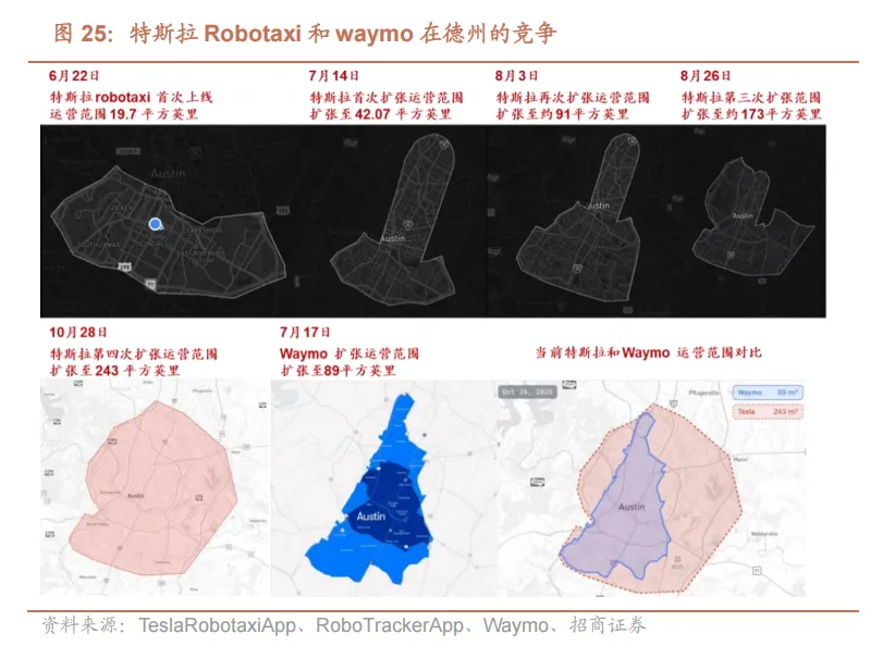 特斯拉与 Waymo 在德州的运营扩张,成为 Robotaxi 行业加速发展的缩影。特斯拉Robotaxi自2025 年6月22日在奥斯汀首次上线后,通过四轮持续扩张完成服务范围的快速拓展:初始仅覆盖市区南部约20 平方英里试点区域,7 月14日向北延伸至约42 平方英里,8月3日扩至约91 平方英里并覆盖更多主干道与居住区,8月26日第三次扩张后服务区达约173 平方英里,基本囊括核心城区大部分区域,10月28日第四次扩张后进一步增至约243 平方英里,覆盖面接近整个奥斯汀建成区,为后续车队规模提升与订单密度改善奠定基础。作为对比,Waymo 于2025 年7月17 日宣布将奥斯汀无人驾驶服务区由37 平方英里扩大至约89 平方英里,形成贯穿南北、相对集中的走廊型运营区域。