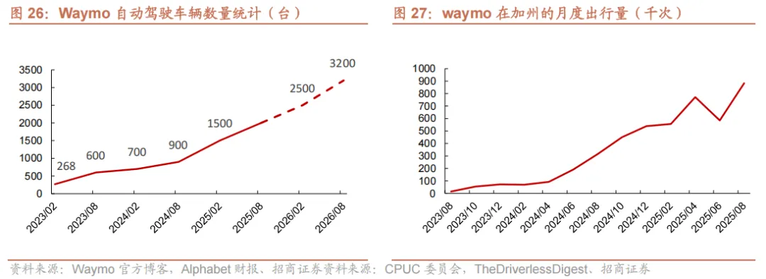 2025 年4月,Waymo 在旧金山、洛杉矶、凤凰城、奥斯汀、亚特兰大及硅谷部分区域六个城市提供付费自动驾驶服务,周订单量超过25万单。在2024年9月至2025 年9 月间,Waymo 加州出行单量增长约3 倍,于2025 年6 月在旧金山网约车市占率达到27%,并于2025年9 月在加州整体网约车市占率超过3%。2025 年11月,Waymo宣布启动迄今最具雄心的商业扩张:计划到2026 年底将无人驾驶出租车服务覆盖至少15 座美国城市,新增拉斯维加斯、底特律与圣迭戈三大枢纽,并快速跟进迈阿密、达拉斯等城市的完全自主测试及多城部署。这一布局标志着Waymo 从区域试点迈向全国性路网运营的关键转折,也使其成为美国唯一实现多城全无人商业运营的企业。2025 年12月,Waymo 无人驾驶出租车单周付费出行超45万,较2025 年4月的25万次增长80%;最新车队规模2500 辆。周订单45万单对应2500 辆车为单车日均25.7 单,日单量已达网约车合理水平。