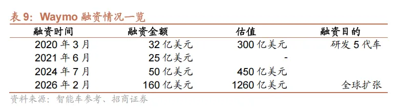Waymo官宣完成160 亿美元融资,估值达1260 亿美元。2026 年2月2 日,Waymo宣布完成160 亿美元融资,估值达到1260 亿美元。Waymo透露,其在美国6 大都市区周订单量已超40 万单,2025年全年订单量为1500 万单,是2024年的两倍多,历史订单量已超2000 万单,全自动驾驶里程已超2亿公里。公司表示2026 年的重点是在美国全境及国际范围推广其自动驾驶出租车服务,目前其正式运营服务已覆盖美国10 个城市,目标是在一年内扩展至约20 个都市区,其中包括英国伦敦和日本东京等美国以外的城市。