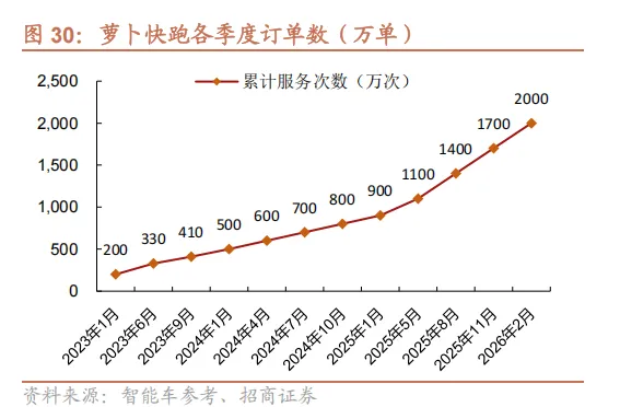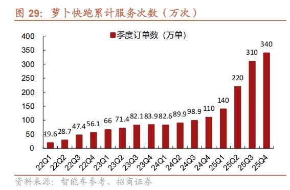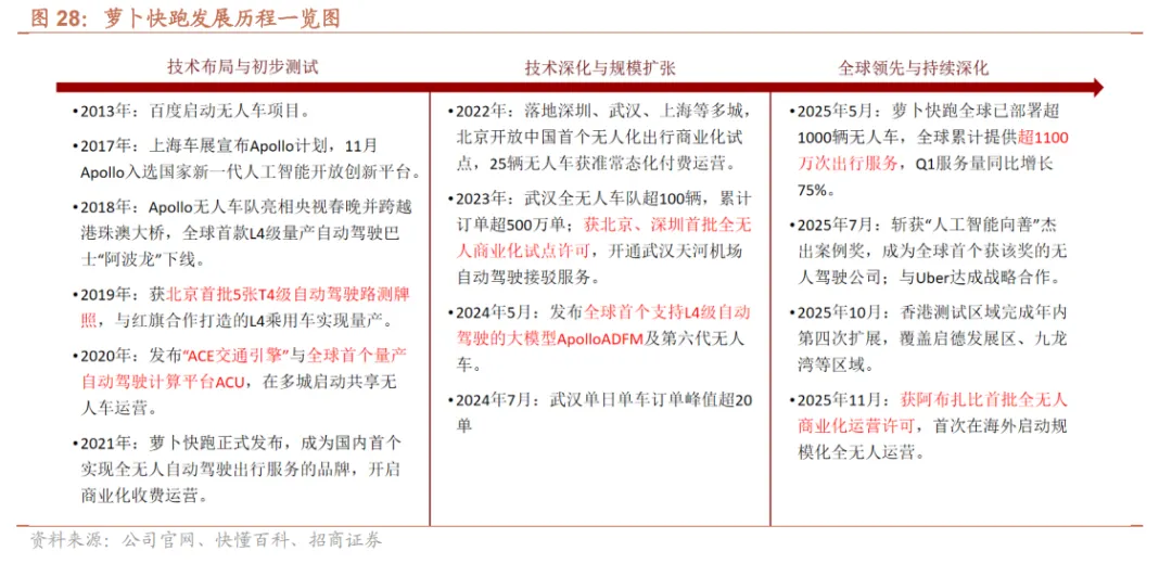 萝卜快跑规模化运营领跑行业,成本优势显著。截至2025 年10 月31 日,萝卜快跑全球累计服务订单超1700万次,总行驶里程突破2.4 亿公里,其中全无人行驶里程达1.4 亿公里,国内Robotaxi 赛道中仅其全无人里程接近Waymo。到2025 年底,每周全无人订单超25 万单,位居全球行业榜首。成本端,主力车型第六代无人车单车成本20.46 万元,较第五代下降60%,仅为Waymo的1/7,为规模化运营与盈利奠定基础。