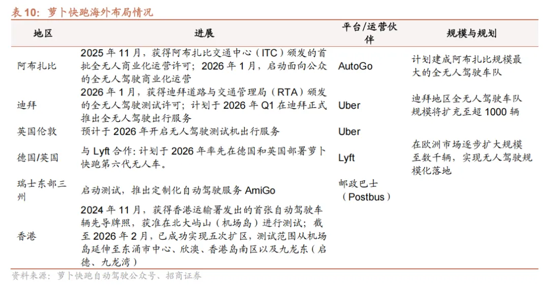 萝卜快跑正加速开拓海外市场,海外布局已形成“中东优先突破、欧洲联动试点、香港长期验证”的三支轴线。在阿布扎比已面向公众启动全无人商业化运营,在迪拜获全无人测试许可并将率先通过Uber 平台上线、规划数年内扩至1000+车辆;欧洲端与Uber、Lyft和瑞士PostBus多线合作,2026 年起在伦敦、德国、瑞士落地;香港多次扩区,夯实右舵及复杂城区的工程与合规能力。整体以“平台合作+本地运营商+前装量产车RT6”的轻资产策略加速复制。