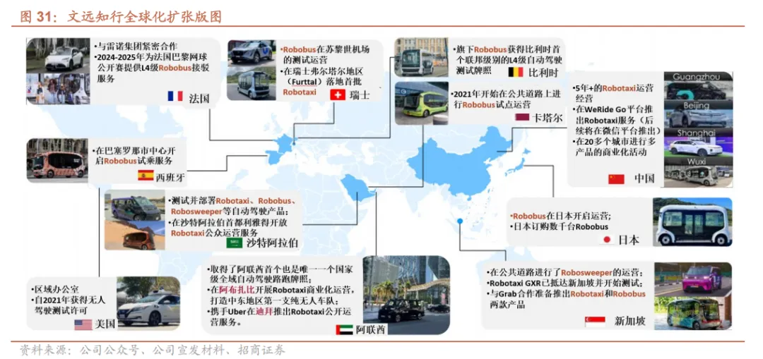 在海外市场,文远知行拥有先发优势,重点发展中东、欧洲及东南亚等具有良好应用潜力和成本效益的地区。根据灼识咨询的资料,1)在法国、瑞士和比利时,公司是迄今为止唯一一家成功部署L4 自动驾驶解决方案的公司。2)在新加坡,公司是唯一一家同时拥有Robotaxi与Robobus 运营的自动驾驶公司,在L4开发方面领先下一个市场进入者至少1.5年。3)在阿联酋,公司运营着该国规模最大的自动驾驶出租车车队,在L4自动驾驶部署方面领先第二家2年多,并且是全球第一家在中国和美国以外开展完全无人驾驶测试的公司,服务正逐步融入迪拜的公共交通体系。4)在沙特阿拉伯,公司自动驾驶出租车获得了沙特阿拉伯首张自动驾驶出租车运营许可,在L4自动驾驶实施方面领先第二家约2 年。
