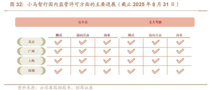 小马智行聚焦“价值密度”更高的一线城市发展,规模化落地国内领先。北京、上海、广州、深圳是国内监管要求最严格、路况最复杂、客流最密集的城市群,也是Robotaxi商业验证最具代表性的区域。根据现行监管框架,中国四个一线城市均颁发六类自动驾驶出租车许可证,具体而言,可分为两大类自动驾驶出租车许可证:一类用于在安全员在场的情况下自主运行的自动驾驶出租车,另一类用于完全无人驾驶的L4 自动驾驶出租车。每一大类又分为三种特定类型的许可证:测试许可证、面向公众许可证及收费许可证。公司是中国唯一一家获得中国四个一线城市可获得的所有类型自动驾驶出租车许可证的L4自动驾驶科技公司,是少有的在四大一线城市同时获得L4 运营许可并落地全无人收费服务的企业。