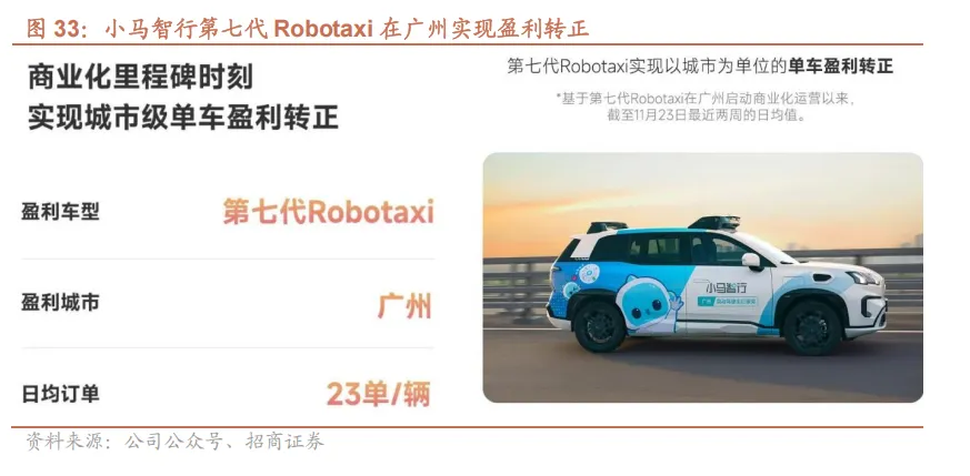 小马智行在广州和深圳实现城市级单车盈利转正,达到商业化里程碑时刻。据公司2025 年三季报,基于公司第7 代Robotaxi 在广州启动商业化运营以来,截止2025 年11月23 日最近两周,公司实现日均订单23 单/辆,实现了单车盈利转正。这一事件标志着公司已从技术验证阶段全面转向商业模式的规模化复制阶段。2026 年3 月,小马智行宣布其第七代Robotaxi于2026 年2 月在深圳实现月度单车运营盈利转正,继25 年11月在广州达成该目标后,小马智行已在两座中国一线城市实现关键突破,这标志着Robotaxi 市场化运营进一步取得实质性进展,规模化运营基础持续夯实。