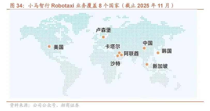 小马智行海外业务同步推进,积极拓展全球战略版图。在亚洲,公司已取得韩国国家级自动驾驶测试许可,已于2025 年初在韩国首尔启动路测,并于4 月将首尔江南区的测试拓长至7x24小时;此外,与新加坡最大的交通运营服务商康福德高联合部署自动驾驶服务。在中东,公司5月与迪拜道路交通管理局战略合作,宣布2025年实现首批Robotaxi开启路测,2026年推进实现全无人商业化运营,并携手卡塔尔国家运输公司在首都多哈成功开展Robotaxi公开路测。在欧洲,公司于2025 年7 月在卢森堡启动Robotaxi测试,率先在伦宁根市开启并扩展至更多区域。截止2025 年11月,公司Robotaxi 业务覆盖8 个国家。
